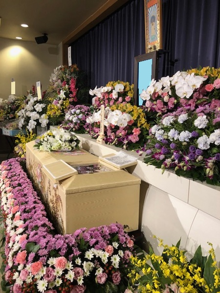 彼方で穏やかに過ごす妻の笑顔を思い描きながら、色とりどりの花とともに送り出します。